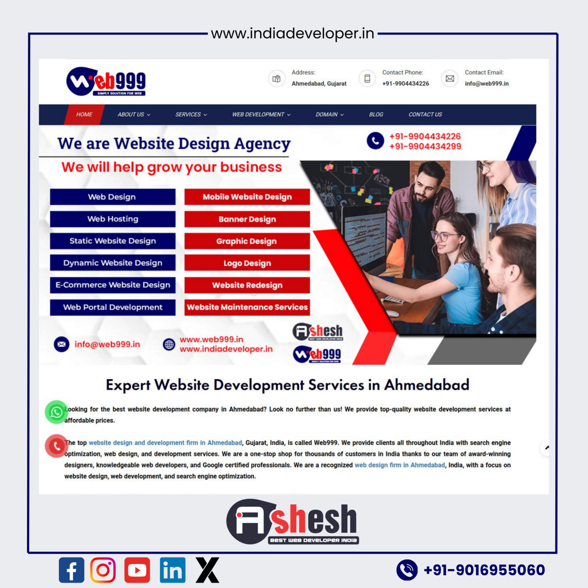 Web999, based in Ahmedabad, specializes in delivering affordable and innovative web development and design services. Our range of offerings includes website design, e-commerce solutions, logo creation, web hosting, SEO, and internet marketing, all customized to enhance your online presence and amplify brand visibility. Contact us today to elevate your digital journey!